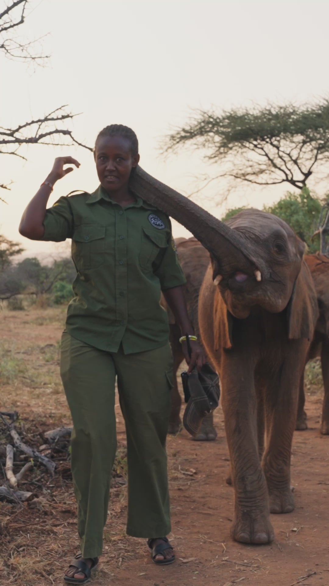 Watch how your support will help. Keeper Naomi on a walk with Ngaremara - orphaned at two months old after becoming separated and seeking out comfort at the homestead of the Turkana people which led to her eventual rescue and home at Reteti.
